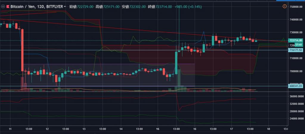 BTC/JPYの2時間足チャートをみていきます。10月15日に大陽線を形成したBTC、その後一時反落をみせ、72万円台で値動きを落ち着かせます。一時反落をみせたBTCではありましたが、その後緩やかに上昇します。しかし緩やかな上昇は9月4日以降の下降トレンドラインに上昇を抑えられた形で終えました。本日10月17日も継続してトレンドラインに抑えられた値動きをみせています。