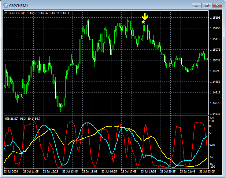 上の5分足を見てみると三尊の右肩となりうるレベル付近でmBDSR(フィルター:RCI26とRCI52)の戻り売りサインが点灯してプライスは大きく下げている。