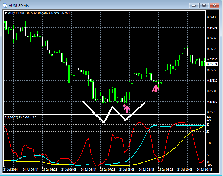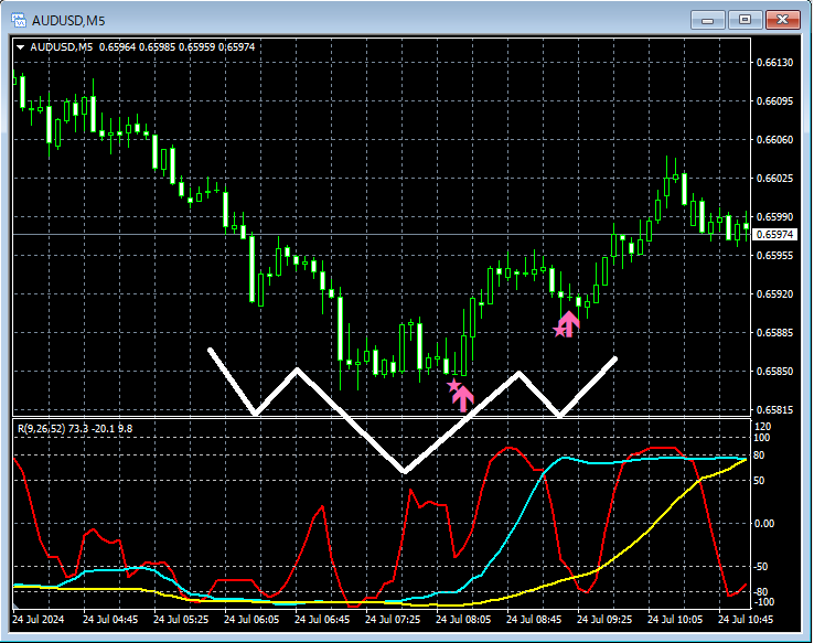逆三尊の真ん中の谷は細かく見るとダブルボトムと見ることができる。すなわち、逆三尊の真ん中の谷に点灯したmBDSR(RCI2本フィルター)の押し目買いサインはダブルボトムの右側の谷に点灯していると見ることもできる。