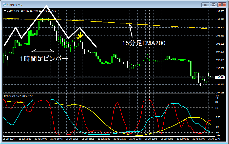 上の5分足では、1時間足におけるピンバー(上ヒゲの長いローソク足)出現に伴う下落後の上昇でmBDSR(フィルター:RCI26とRCI52)の戻り売りサインが点灯している。このサインは15分足EMA200付近を真ん中の山として形成された三尊の右肩における下落開始のタイミングを上手くとらえている。