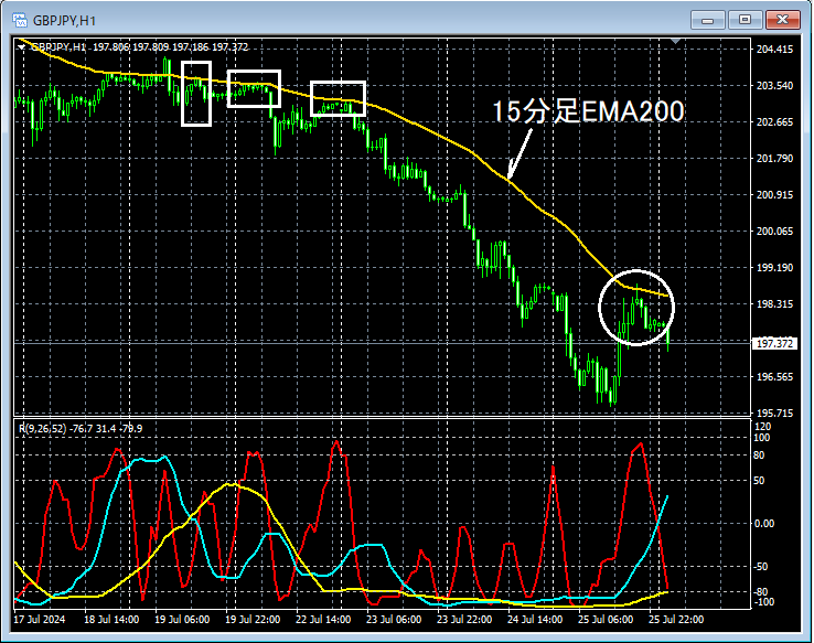 上の1時間足で白い円で囲ったあたりを見ると、これまでレジスタンスとして機能してきて重要視している15分足EMA200付近まで上昇してきたところで下落を示唆するピンバー(上ヒゲの長いローソク足)が出現していることが分かる。下位足で戻り売りを考えてもおかしくない場面かもしれない。