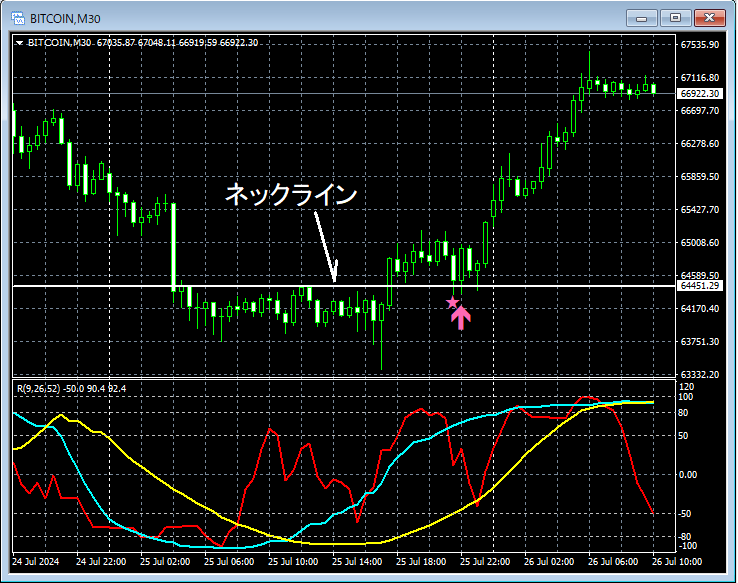 上の30分足では、ネックライン付近まで下げてきたところでmBDSR(RCI2本フィルター)の押し目買いサインが点灯して、その直後からプライスは順調に上昇している(いわゆるレジサポ転換からの上昇)。