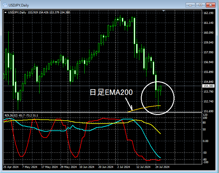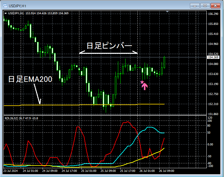 【本日のドル円攻略】重要視している移動平均線と日足ピンバーとmBDSR(RCI2本フィルター)の押し目買いサイン 2024年7月26日のドル円チャートから