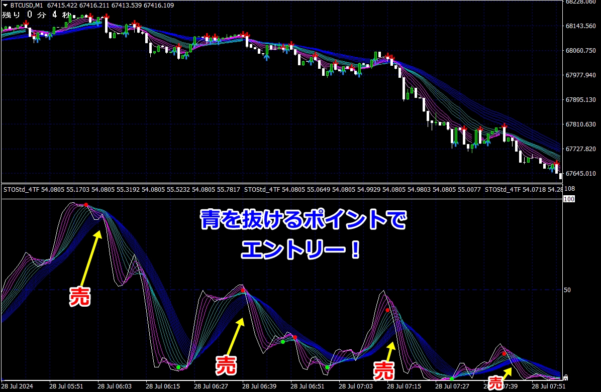 インジケーターの帯はピンク・緑・青の3層構造で、3層の帯は、収斂と拡散を繰り返しますので、 上昇時は、上から ピンク・緑・青 の並びとなり、下落時は、その逆で、上から青・緑・ピンクの並びになります。