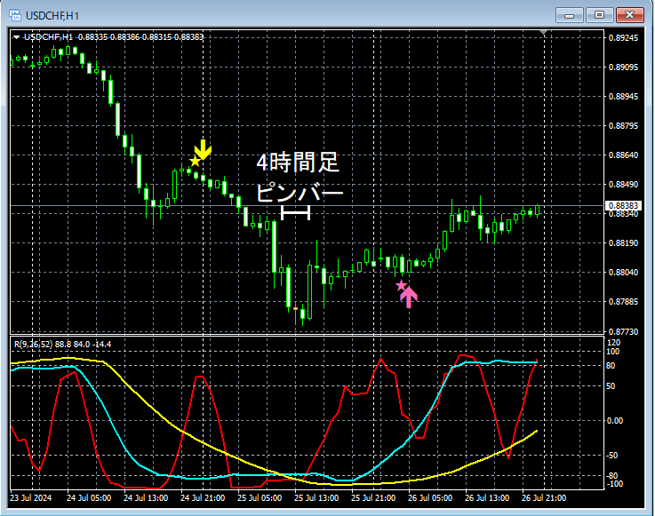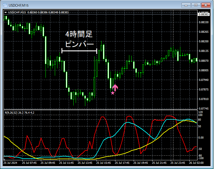 上位足のピンバー(下ヒゲの長いローソク足)とmBDSR(RCI2本フィルター)のサイン