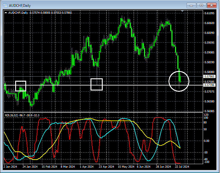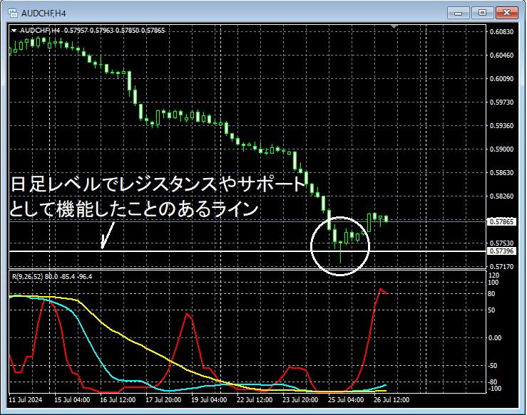 上の日足で白い円で囲ったあたりを見ると、過去にレジスタンスやサポートとして機能したことのあるライン付近まで下げてきていて、このラインがサポートとして機能するか注目することにする。