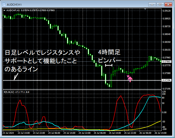 気になる水平線と上位足のピンバーとmBDSR(RCI2本フィルター)の押し目買いサイン
