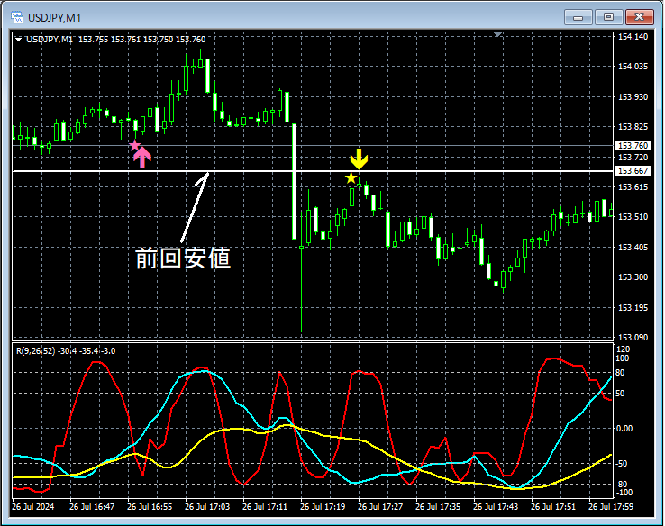 上の1分足では、直近安値を示すラインを下抜けした後、そのライン付近まで上昇してきたところでmBDSR(フィルター:RCI26とRCI52)の戻り売りサインが点灯し、その直後からプライスはしっかり下げている。