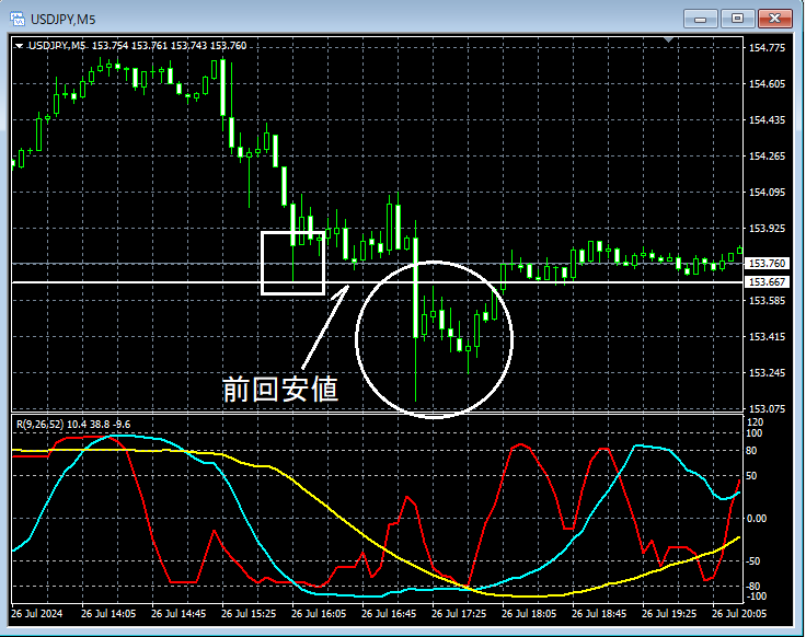 上の5分足で白い円で囲ったあたりを見ると、直近安値を下抜けしている。下位足で詳しく見てみることにする。