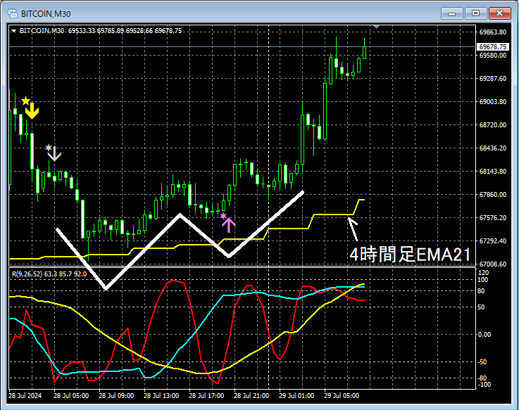 上位足の状況は省略。4時間足EMA21付近での反転上昇の可能性を考えてもおかしくない場面。上の30分足では、mBDSR(RCI2本フィルター)とR1R2S2の戻り売りサインが点灯して4時間足EMA21まで下げている。その後、ダブルボトムを形成して上昇。そのダブルボトムの右側の谷における上昇開始のタイミングをR1R2S2の押し目買いサインが上手くとらえている。