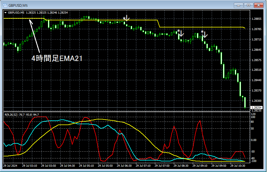 上位足のチャートは省略するが、4時間足EMA21付近での反転下落の可能性を考えてもおかしくない場面。上の5分足では、4時間足EMA21付近からの下げの途中でR1R2S2の戻り売りサインが3回点灯している。