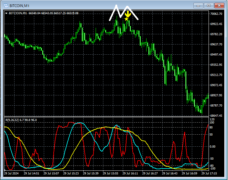 上の1分足では、高値付近でダブルトップを形成し、そのダブルトップの右側の山でmBDSR(RCI2本フィルター)の戻り売りサインが点灯してプライスは大きく下げている。