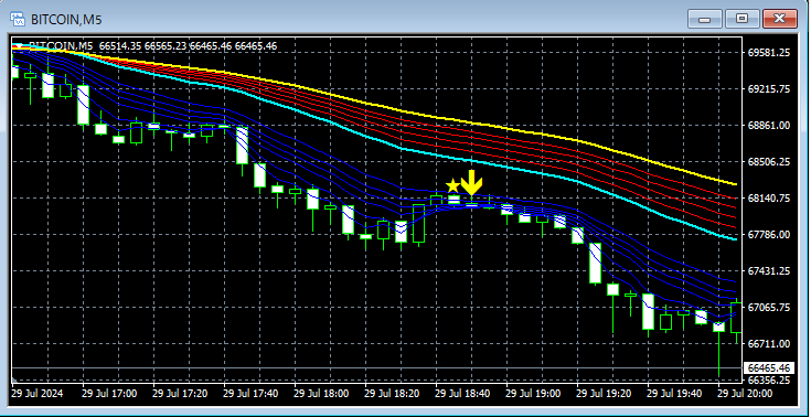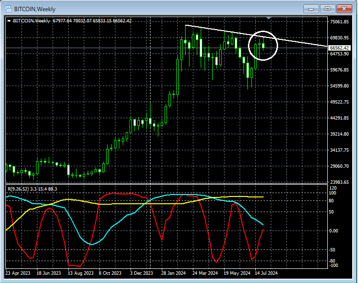 【ビットコイン攻略】2024年7月29日のチャートから 上位足における高値を結んだラインとダブルトップとmBDSR(RCI2本フィルター)の戻り売りサイン