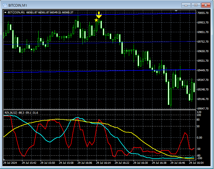 上の1分足では、チャネル上限付近でmBDSR(RCI2本フィルター)の戻り売りサインがタイミングよく点灯していることが分かる。