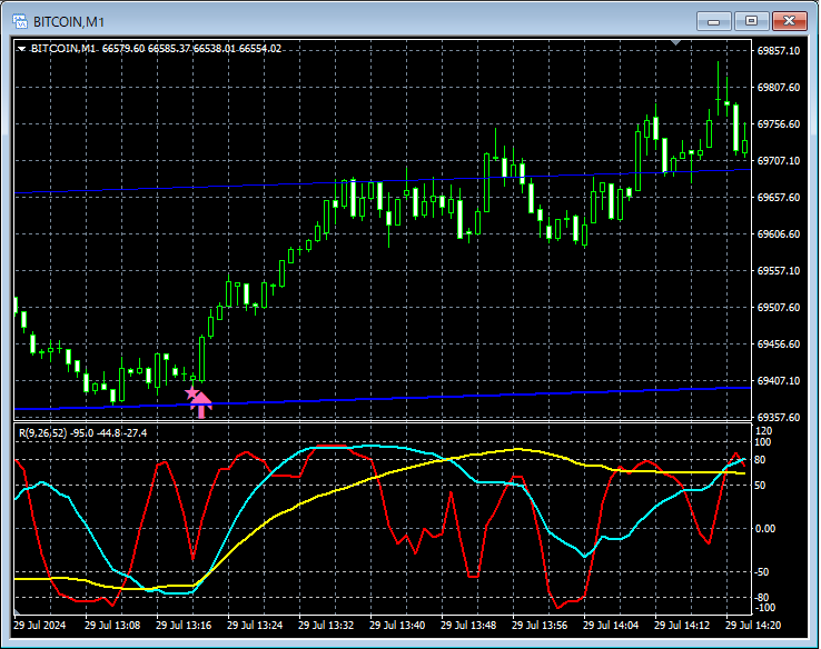 上の1分足では、チャネル下限付近でmBDSR(RCI2本フィルター)の押し目買いサインがタイミングよく点灯していることが分かる。