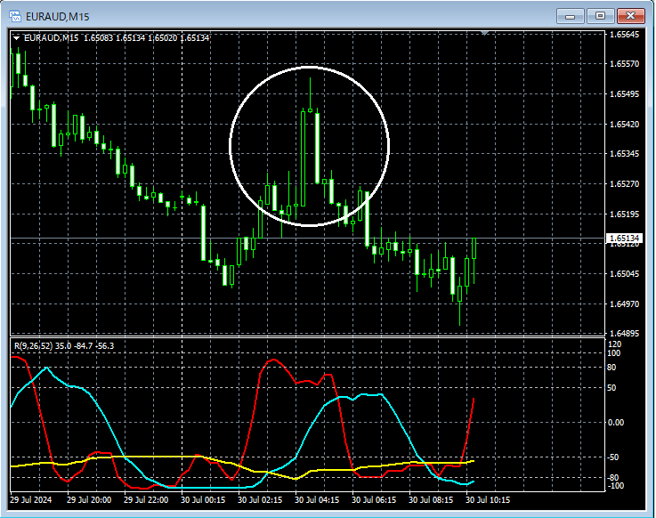 上の15分足で白い円で囲ったあたりを見ると酒田五法の「宵の明星」が出現していることが分かる。このローソク足のパターンは下降転換を示唆するものであり、下位足で戻り売りを考えてもおかしくない場面かもしれない。