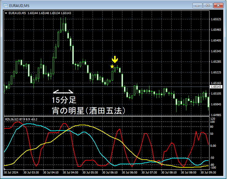 上位足である15分足で酒田五法の「宵の明星」が出現した後、上の5分足ではmBDSR(RCI2本フィルター)の戻り売りサインが点灯して順調に下げている。