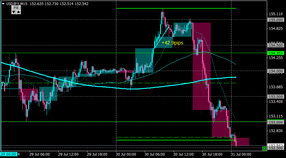 155.0の戻り高値で上げ止まったのでイグジット。+42.9pips