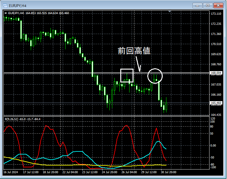 直近高値とmBDSR(RCI2本フィルター)の戻り売りサイン