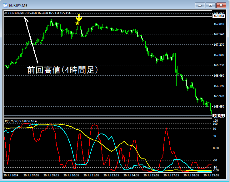 上の5分足では、4時間足レベルの直近高値付近まで上昇したところでmBDSR(RCI2本フィルター)の戻り売りサインが点灯し、その後、プライスは大きく下げている。