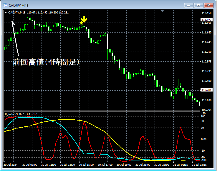 参考までに、上の15分足では、5分足で戻り売りサインが点灯した約4時間後に、mBDSR(RCI2本フィルター)の戻り売りサインが点灯している。