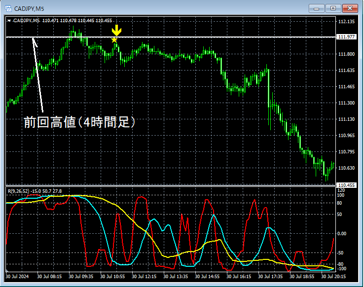 上の5分足では、4時間足レベルの直近高値付近まで上昇したところでmBDSR(RCI2本フィルター)の戻り売りサインが点灯し、その後、プライスは大きく下げている。