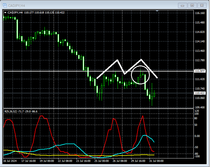 また、ここから安値を更新するような下げの可能性を考え、上のチャートに示したようなダブルトップを意識しておくことにする。