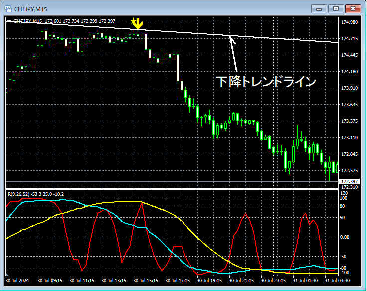 上の15分足では、4時間足の下降トレンドライン付近まで上昇したところでmBDSR(RCI2本フィルター)の戻り売りサインが点灯し、その後、プライスは大きく下げている。