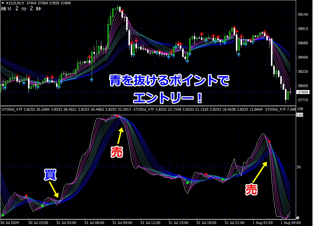 インジケーターの帯はピンク・緑・青の3層構造で、3層の帯は、収斂と拡散を繰り返しますので、 上昇時は、上から ピンク・緑・青 の並びとなり、下落時は、その逆で、上から青・緑・ピンクの並びになります。