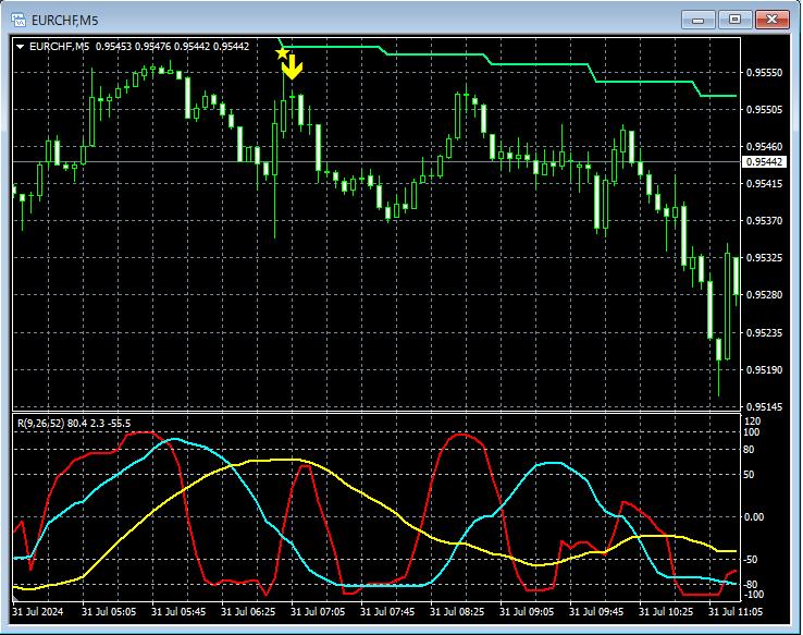 上の5分足では、1時間足で戻り売りサインが点灯した約1時間後にmBDSR(RCI2本フィルター)の戻り売りサインが点灯し、その後、プライスはしっかり下げている。