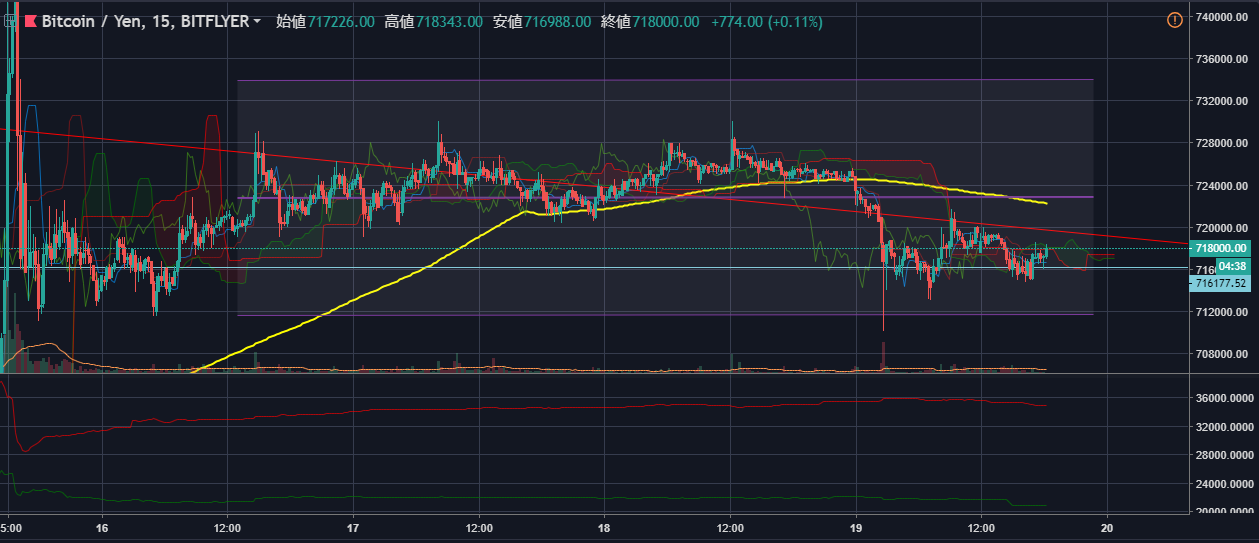 BTC/JPYの15分足チャートをみていきます。10月16日から18日までレジスタンスラインを73万円台、サポートラインを71万9千円台として方向感の無い値動きをみせてきたBTC、10月18日の日本時間12時台にはレンジ相場へ突入してから3度目のレジスタンスラインへの接触をみせます。