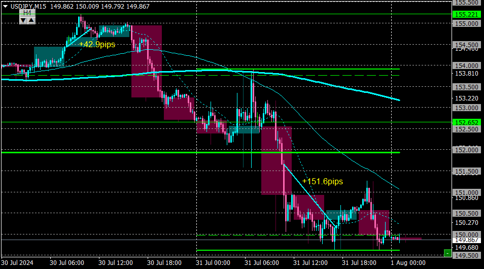 150.0のキリ番で下げ止まったのでイグジット。+151.6pips