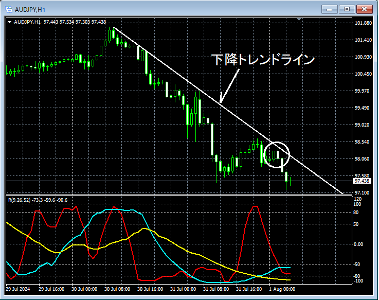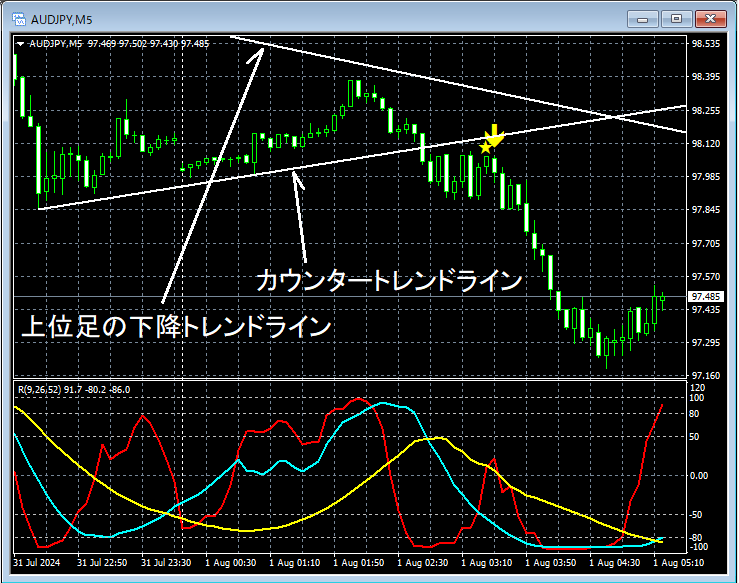 上の5分足では、1時間足の下降トレンドライン付近まで上昇したところで反落気味。カウンタートレンドライン割れの後の上昇でmBDSR(RCI2本フィルター)の戻り売りサインが点灯し、その後、プライスは大きく下げている。