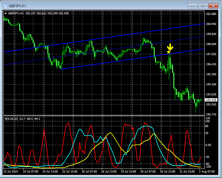 上の1時間足では、下降フラッグを下抜けした後の上昇で、mBDSR(RCI2本フィルター)の戻り売りサインが点灯し、その後、プライスは大きく下げている。