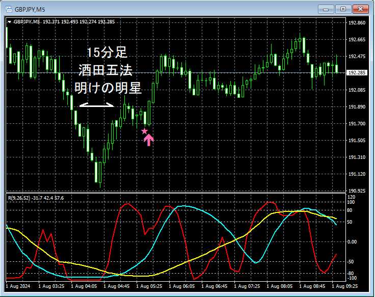 上位足である15分足で酒田五法の「明けの明星」が出現した後、上の5分足ではmBDSR(RCI2本フィルター)の押し目買いサインが点灯して順調に上昇している。