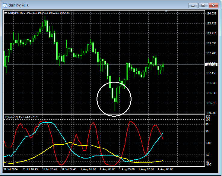 上の15分足で白い円で囲ったあたりを見ると酒田五法の「明けの明星」が出現していることが分かる。このローソク足のパターンは上昇転換を示唆するものであり、下位足で押し目買いを考えてもおかしくない場面かもしれない。