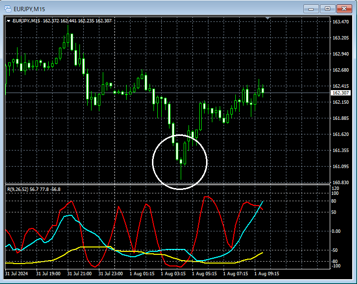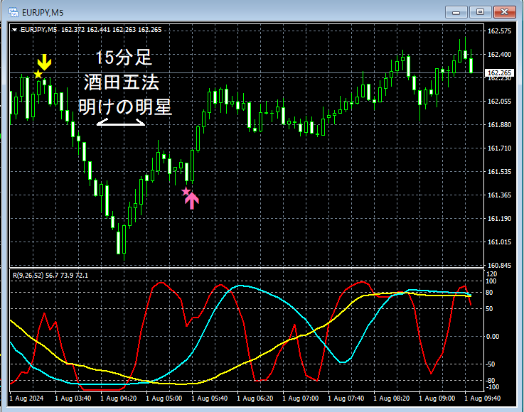 上の15分足で白い円で囲ったあたりを見ると酒田五法の「明けの明星」が出現していることが分かる。このローソク足のパターンは上昇転換を示唆するものであり、下位足で押し目買いを考えてもおかしくない場面かもしれない。