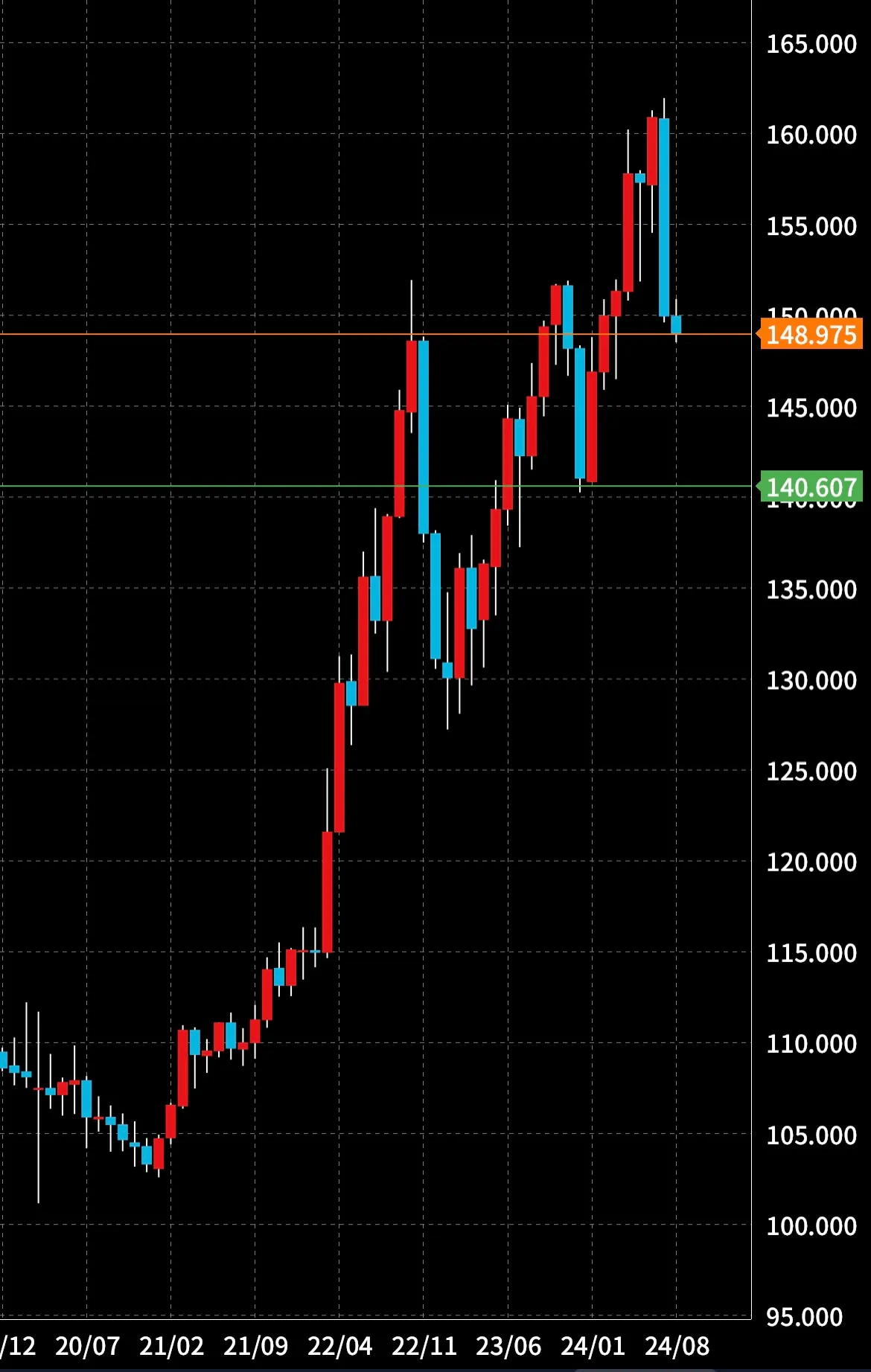 このまま下げた場合、126ミドルが一旦のゴールとなっている、億トレ月足チャートです。