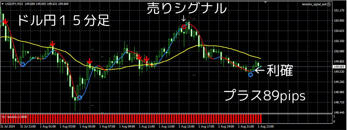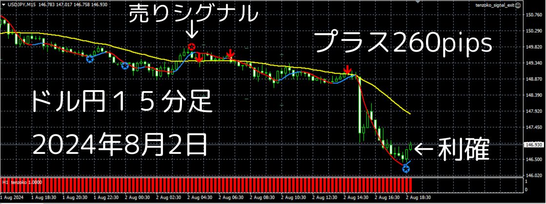 ★のマークで売りシグナルさらにトレンド追撃シグナルの矢印↓まで出て最高の下落パターン