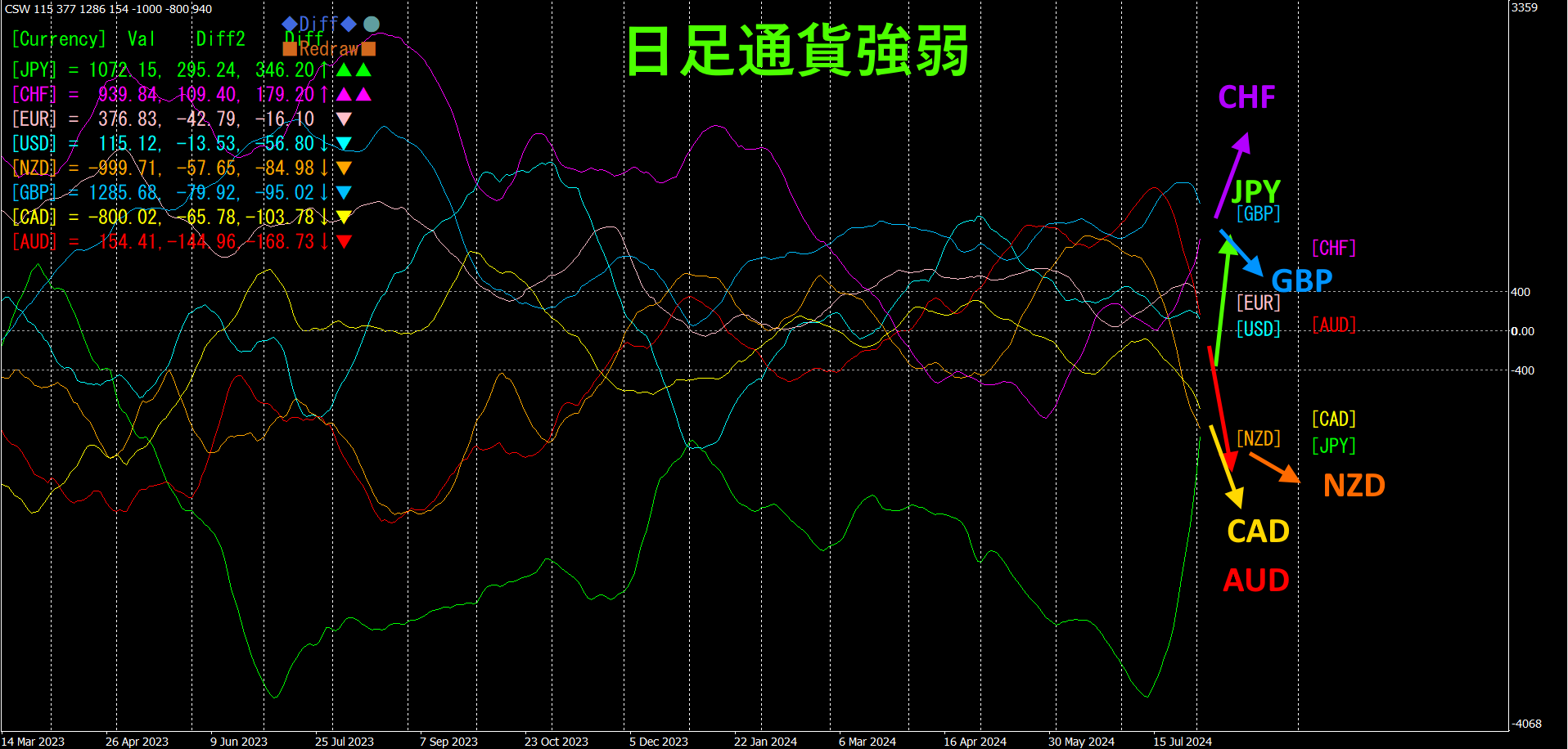 JPY、CHFが上向きです。一方、AUD、CAD、GBP、NZD、USDが下向きになっています。日足通貨強弱チャートではJPYの極端な上昇とAUDの下降が目立っています。