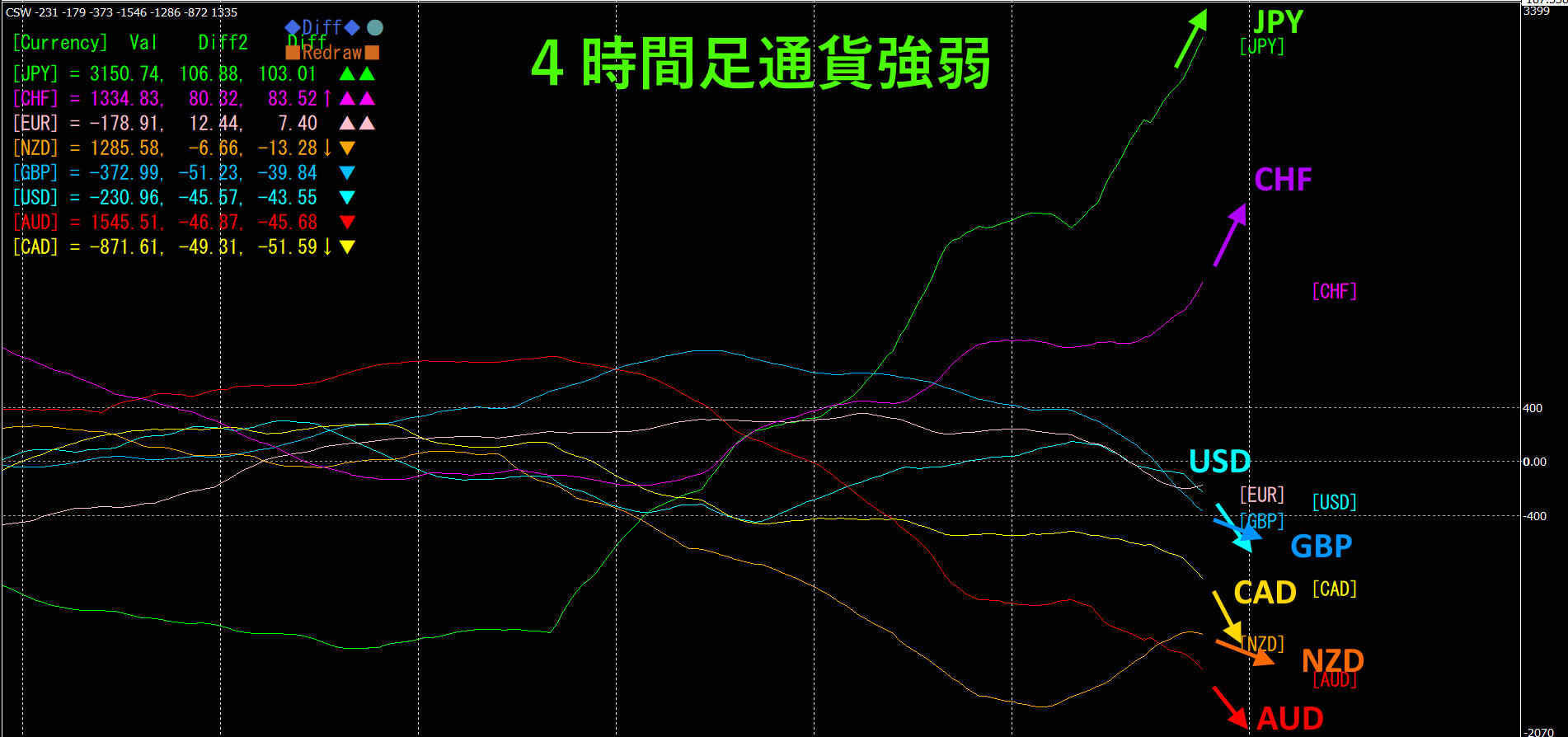 4時間足では、JPY、CHFが上昇しています。一方、CAD、AUD、USD、GBP、NZDが下向きになっています。