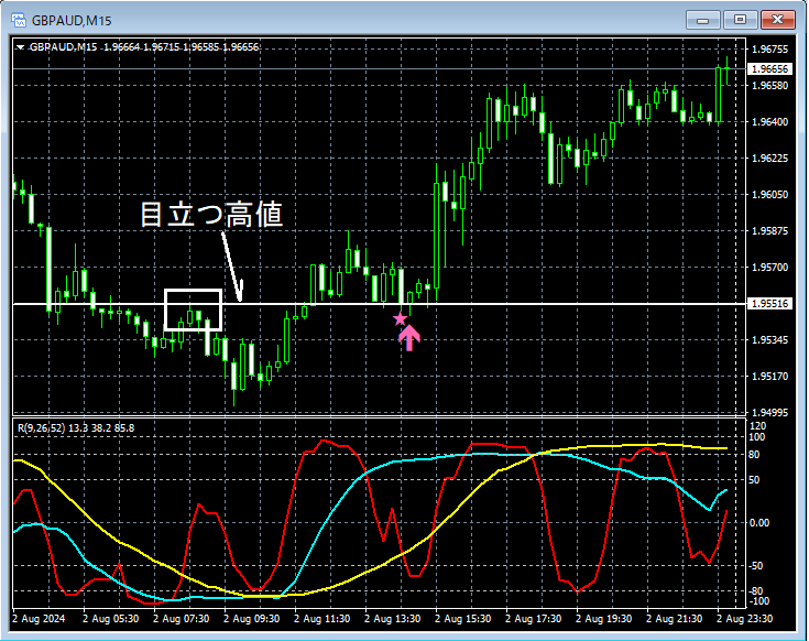 この例から、目立つ高値に注目したトレード手法とmBDSRのサインとの親和性の高さがうかがえる。