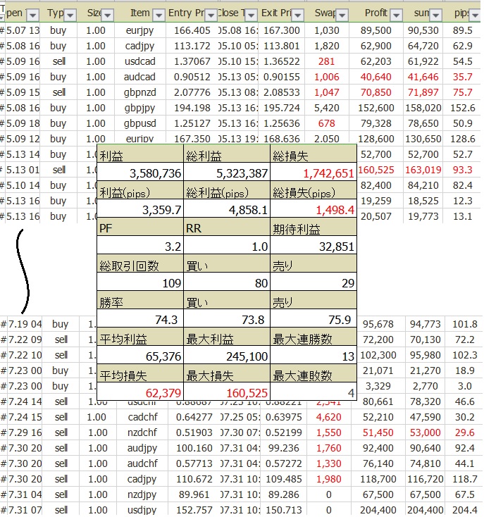 5月~7月のフォワード計測では純利益約358万、獲得Pips3,359pips、PF3.2、勝率74.3%の成績を収めています。