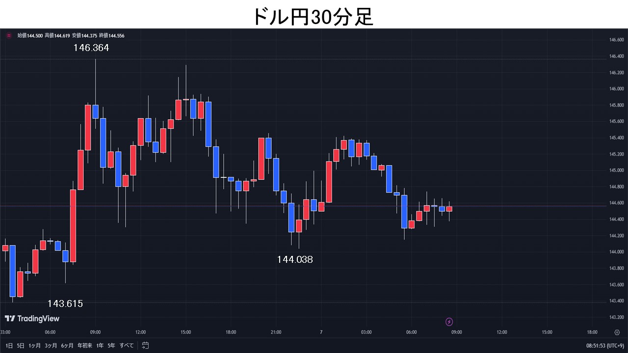 ドル円、8/5の暴落から戻りきれず143円台から146円台で神経質な動き。