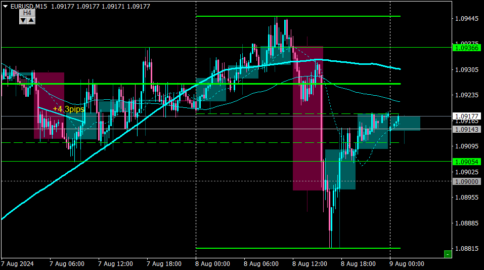 〇前日のトレード・USDJPY ドル円(15分足)昨日は先週安値141.50付近での値動きにとどまったためノートレード。・EURUSD ユーロドル(15分足)昨日は1.090付近でのプライスアクション