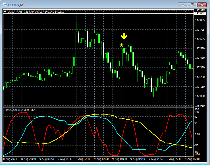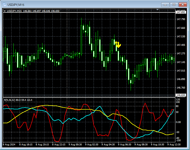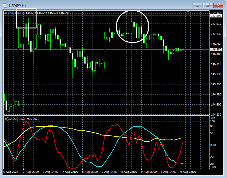 ドル円の昨日(2024年8月10日)のチャートから -前回高値とmBDSR(RCI2本フィルター)のサイン-