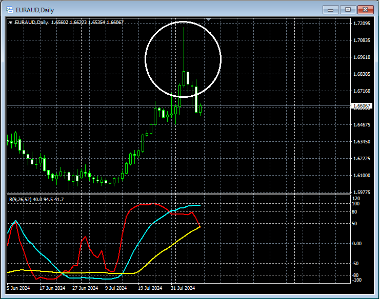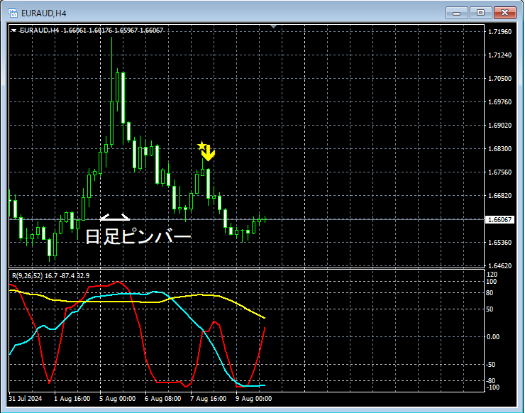 上の日足で白い円で囲ったあたりを見ると、下落を示唆する上ヒゲの長いローソク足が出現していることが分かる。下位足で戻り売りを考えてもおかしくない場面かもしれない。
