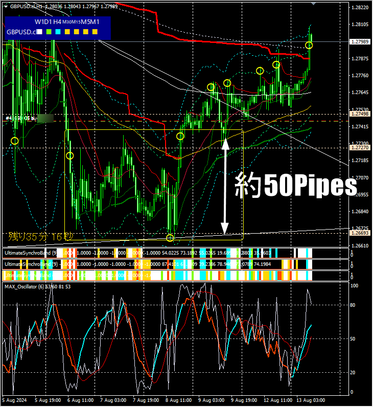 重要な事① MAXオシレーターの反転警戒サインプラス、シンクロバンドのシンクロを確認する。