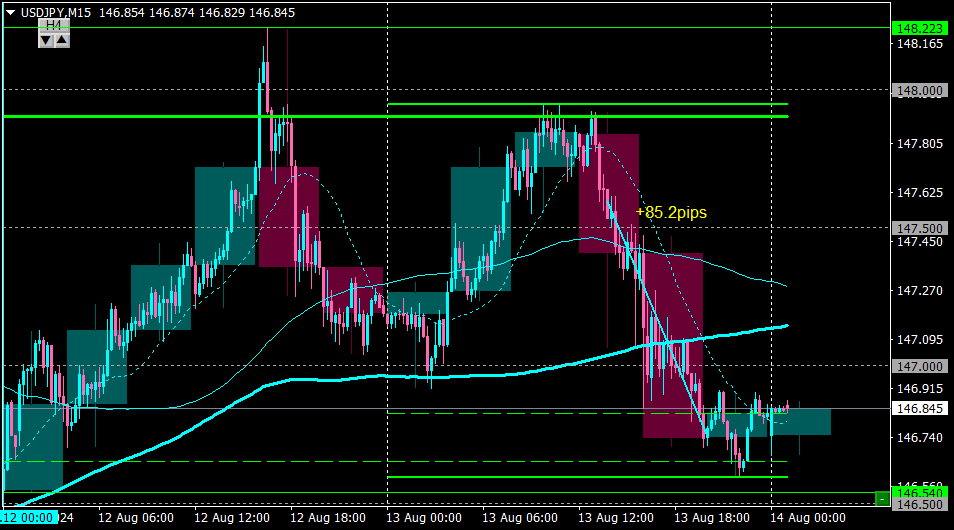 サポートとして機能していたH4MAも下抜けたのでホールドし、H4の足のクローズでイグジット。+85.2pips