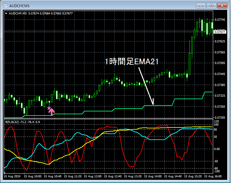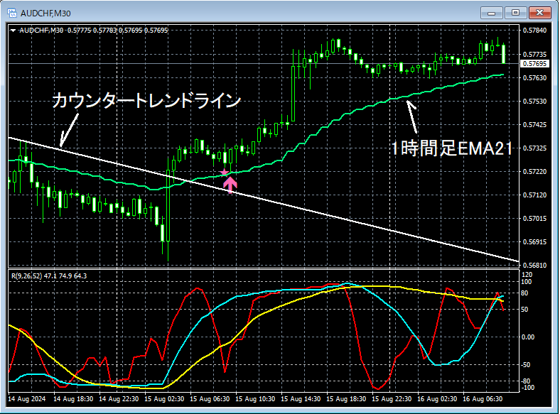 上の30分足では、大陽線形成に伴い、カウンタートレンドラインと1時間EMA21を上抜けしている。その後、その1時間EMA21付近まで下げてきたところでmBDSR(RCI2本フィルター)の押し目買いサインが点灯してプライスは上昇を再開している。